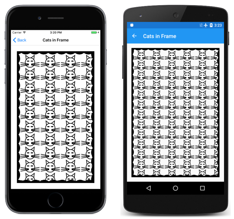 Un uso obvio de CreateSum es definir un objeto SKPaint que rellena una ruta de acceso con un efecto de ruta de acceso y traza la ruta con otro efecto de ruta de acceso. Esto se demuestra en el ejemplo Gatos en marco, que muestra una serie de gatos dentro de un marco con bordes festoneados: