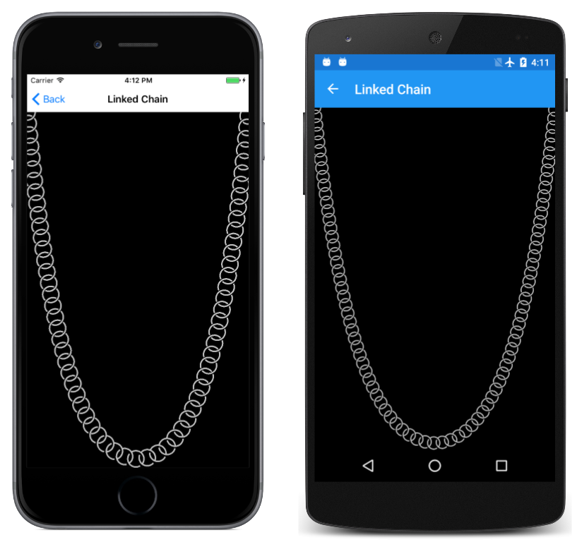 Por ejemplo, en la Cadena vinculada de ejemplo, los vínculos se definieron con una serie de cuatro arcos, cada par de los cuales se basaban en dos radios para describir el área del trazado que se va a rellenar. Es posible reemplazar el código de la clase LinkedChainPage para hacerlo de forma un poco diferente.