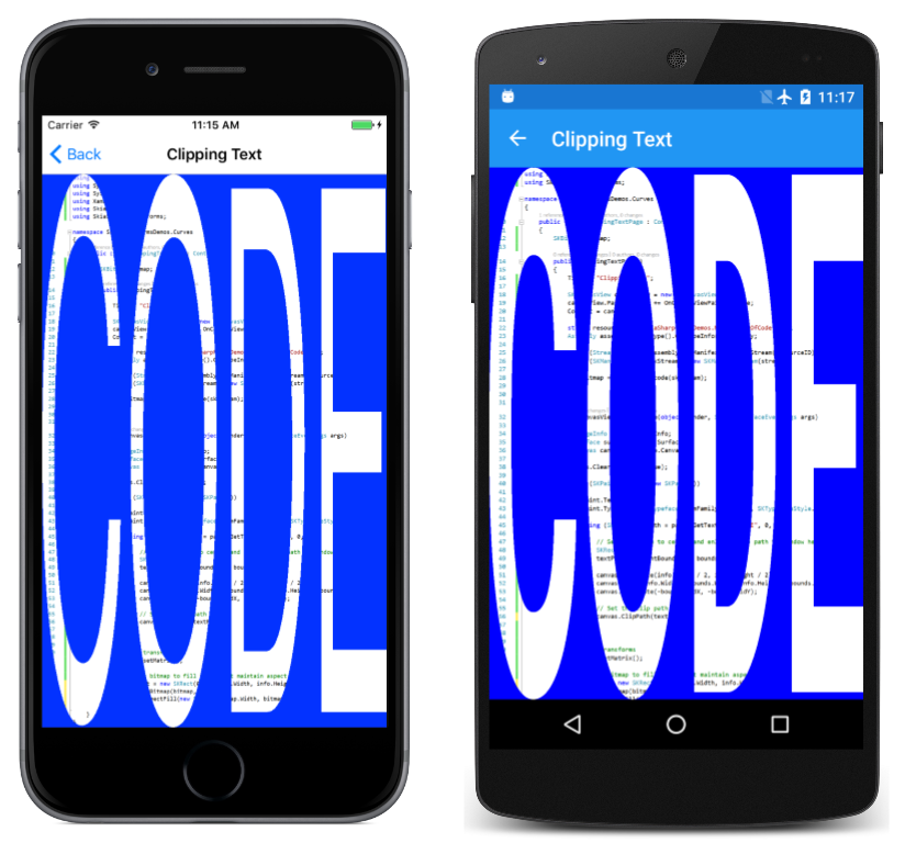 La configuración de las propiedades TextSize y Style no es necesaria porque este objeto SKPaint se usa únicamente para la llamada GetTextPath mediante la cadena de texto "CODE". A continuación, el controlador mide el objeto SKPath resultante y aplica tres transformaciones para centrarlo y escalarlo al tamaño de la página. A continuación, el trazado se puede establecer como trazado de recorte: