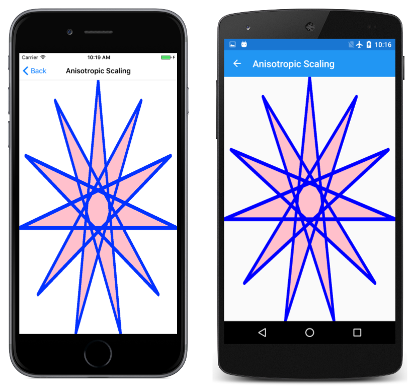La disponibilidad de esta información implica que debe ser posible derivar factores de escala y traslación adecuados para escalar una ruta de acceso al tamaño del lienzo. La página Escalado anisotrópico muestra esto con la estrella de 11 puntas. Una escala anisotrópica significa que es desigual en las direcciones horizontales y verticales, lo que significa que la estrella no conservará su relación de aspecto original. Este es el código pertinente en el controlador PaintSurface: