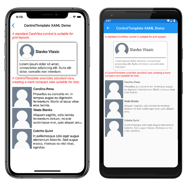 Las capturas de pantalla siguientes muestran una instancia estándar de CardView y CardView cuyo ControlTemplate se ha invalidado: