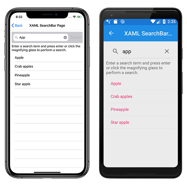 El ejemplo anterior implica la existencia de una clase DataService con un método GetSearchResults capaz de devolver elementos que coinciden con una consulta. El valor de propiedad Text del control SearchBar se pasa al método GetSearchResults y el resultado se usa para actualizar la propiedad ItemsSource del control ListView. El efecto general es que los resultados de la búsqueda se muestran en el control ListView.