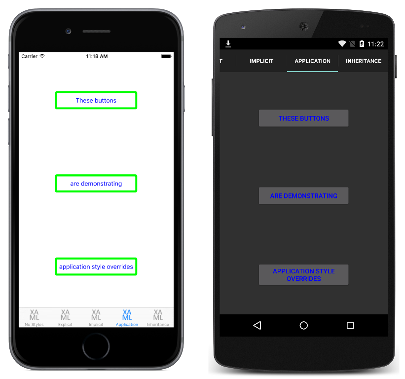 El buttonStyleoriginal, definido en el nivel de aplicación, se invalida mediante la instancia de buttonStyle definida en el nivel de página. Además, el nivel de control reemplaza el estilo de nivel de página buttonStyle. Por lo tanto, las instancias de Button se muestran con texto azul, como se muestra en las capturas de pantalla siguientes:
