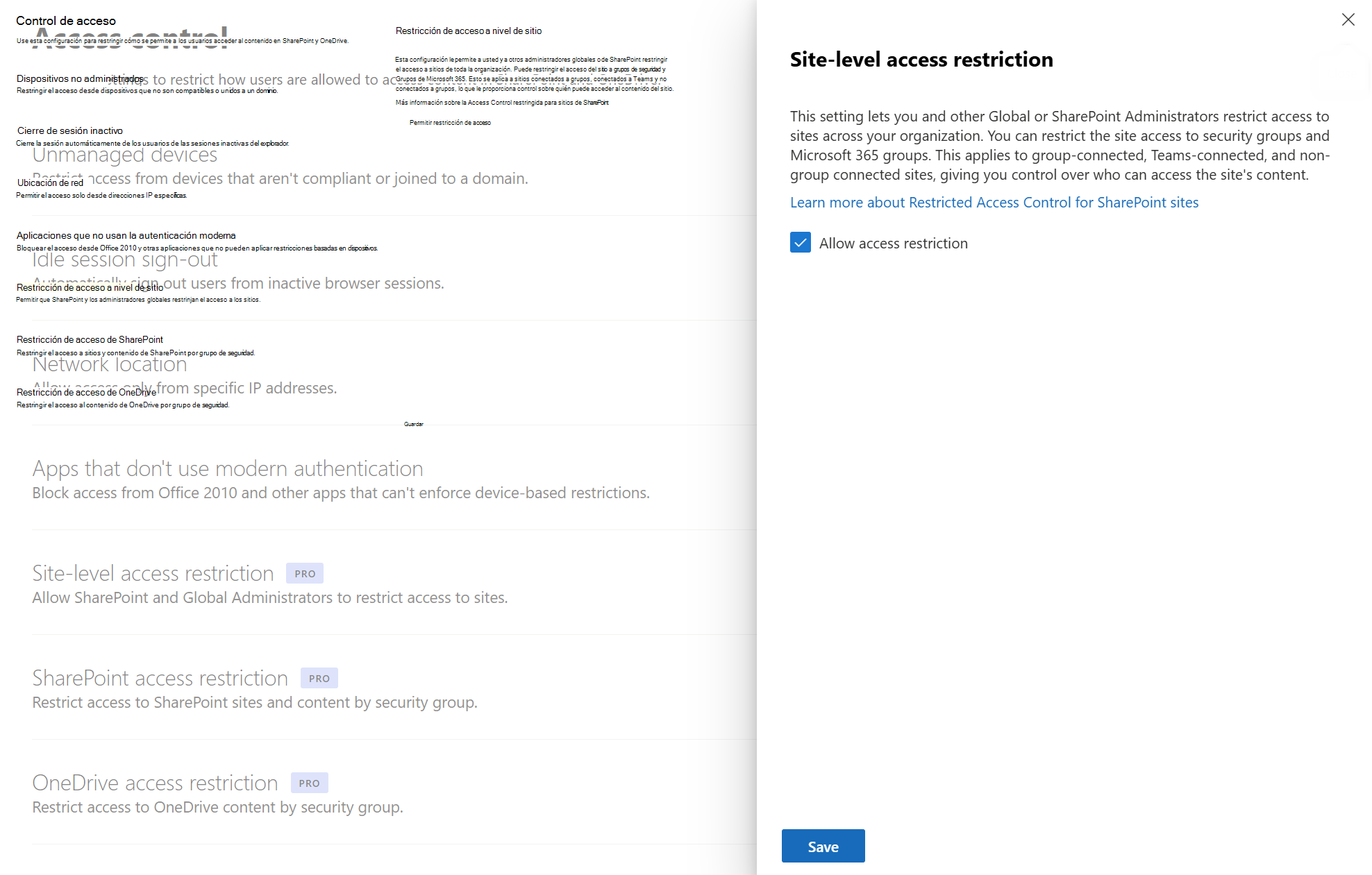 Debe habilitar la restricción de acceso de nivel de sitio para su organización para poder configurarla para sitios individuales.