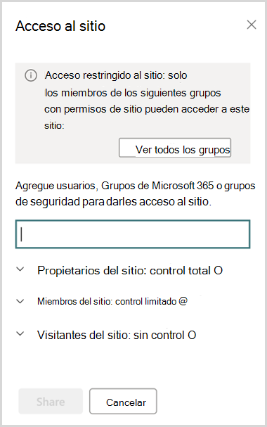 Se permite el uso compartido con Microsoft Entra Security o grupos de Microsoft 365 que forman parte de la lista grupos de Access Control restringidos. Por lo tanto, no se permite el uso compartido con todos los demás grupos, incluidos Todos, excepto usuarios externos o grupos de SharePoint.