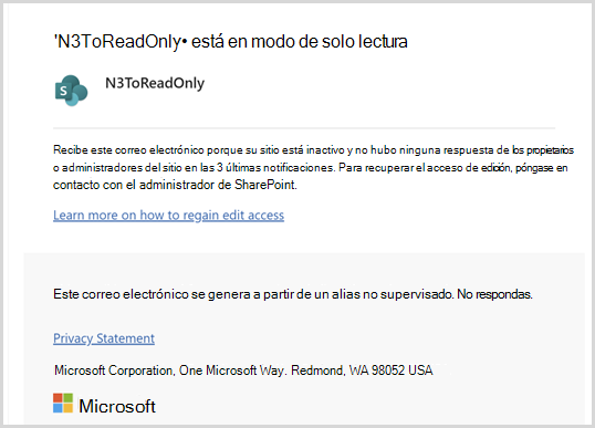 - Cuando un propietario o administrador del sitio selecciona la dirección URL del sitio en el correo electrónico de notificación, esta acción no cuenta como actividad del sitio. El sitio permanece inactivo. Además, las acciones de lectura realizadas en el sitio dentro de una hora de la visita desde el correo electrónico no se consideran actividad. Sin embargo, las modificaciones realizadas en el sitio cuentan como actividad y restablecen el estado de inactividad.