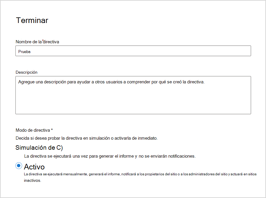 Asigne un nombre a la directiva, agregue una descripción (opcional) y seleccione un modo de directiva. Seleccione Finalizar. Ahora puede ver y administrar la directiva desde el panel Directiva de sitio inactivo de administración > del ciclo de vida del sitio .