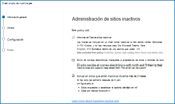Puede configurar parámetros para una directiva de sitio inactiva, como el período de tiempo inactivo, el tipo de plantilla, el origen de creación del sitio, las etiquetas de confidencialidad y la exclusión de hasta 100 sitios.