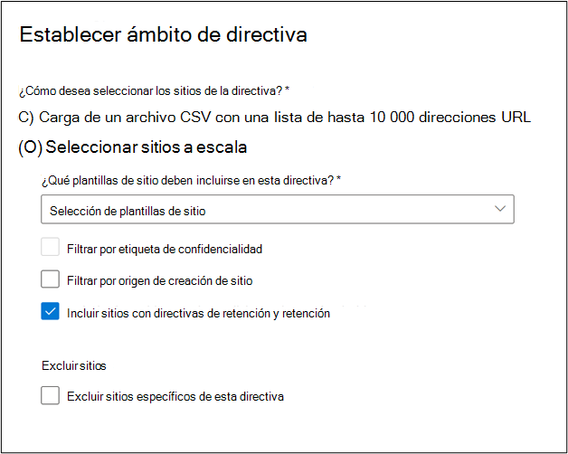 Si selecciona Incluir sitios con directivas de retención y retención, el ámbito de la directiva incluye sitios de solo lectura y sitios bloqueados. El ámbito de la directiva incluye automáticamente todos los sitios inactivos sin propietario.