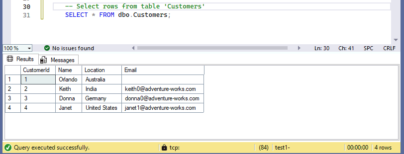 -- Create a new table called 'Customers' in schema 'dbo' -- Drop the table if it already exists IF OBJECT_ID('dbo.Customers', 'U') IS NOT NULL DROP TABLE dbo.Customers; GO -- Create the table in the specified schema CREATE TABLE dbo.Customers ( CustomerId INT NOT NULL PRIMARY KEY, -- primary key column Name NVARCHAR (50) NOT NULL, Location NVARCHAR (50) NOT NULL, Email NVARCHAR (50) NOT NULL ); GOEjecute la consulta seleccionando Ejecutar o seleccionando F5 en el teclado.