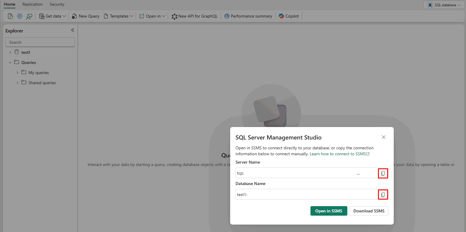 ...menú. Seleccione Configuración y, a continuación, Cadenas de conexión.O bien, seleccione el botón Abrir en y SQL Server Management Studio. Se muestra la información de conexión del servidor.