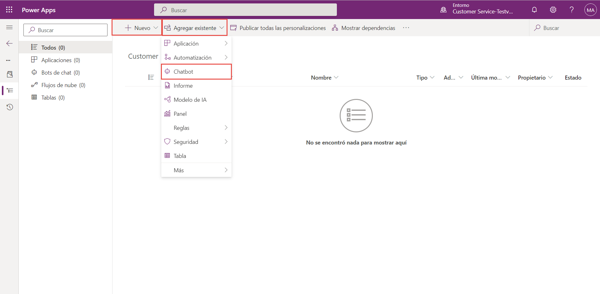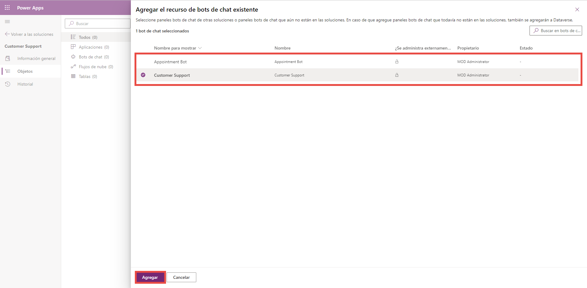 Puede agregar un agente a una solución existente o crear una nueva solución para su agente desde soluciones de Power Apps.