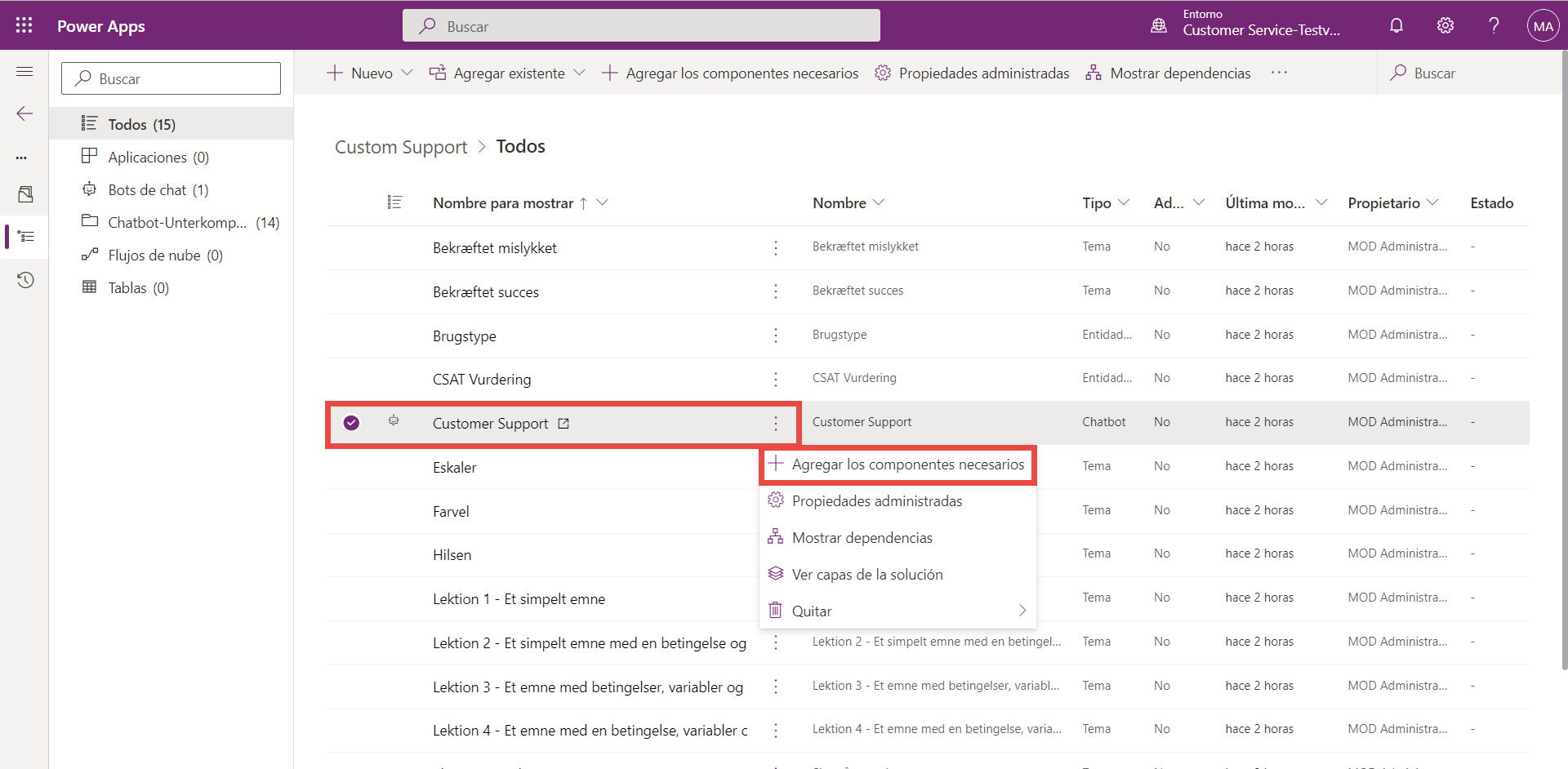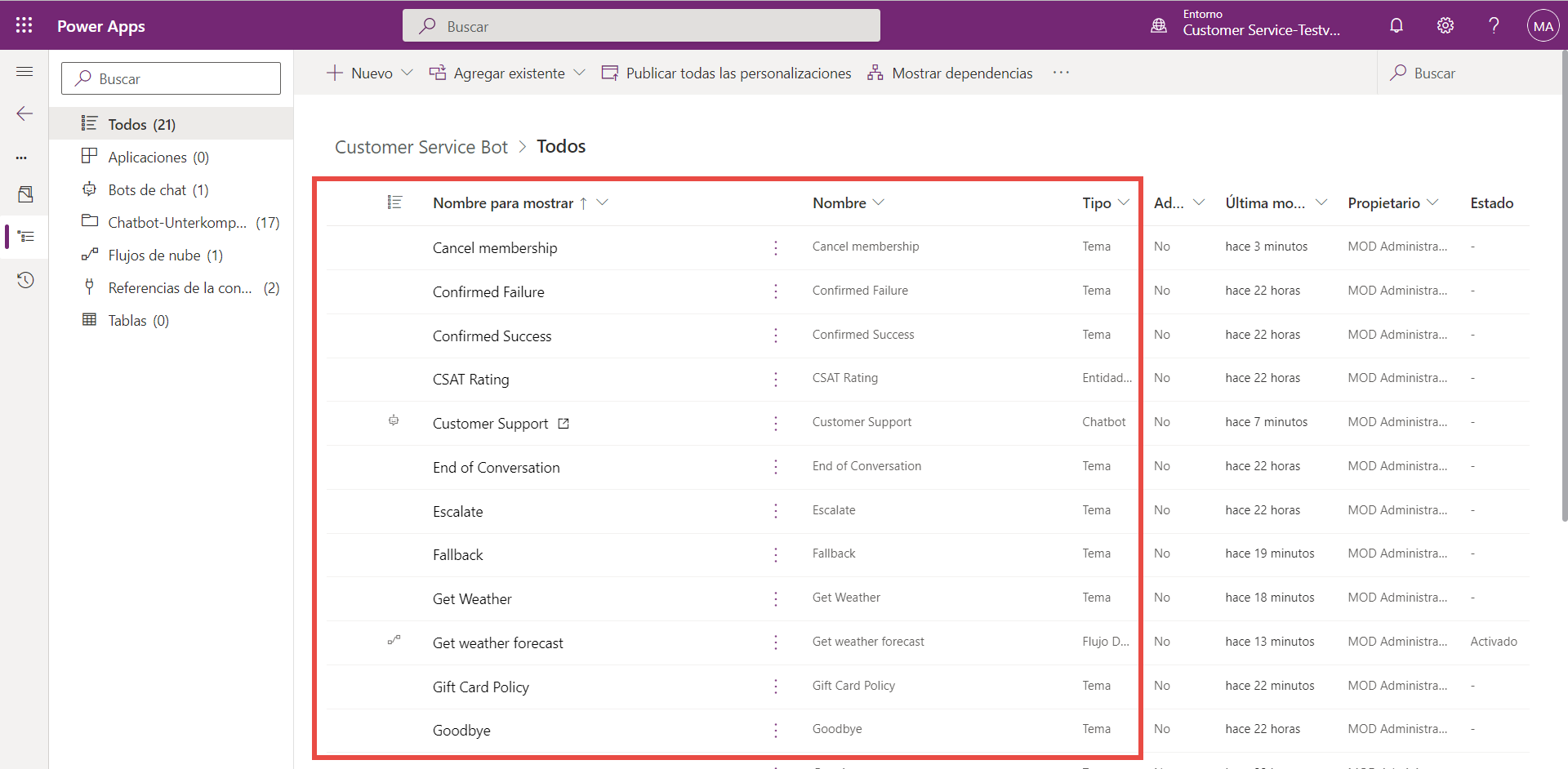 Los subcomponentes del agente se agregarán a la solución, como temas, entidades y flujos de nube. No debe eliminar ni cambiar ninguno de los subcomponentes del agente de Power Apps, ya que esto puede provocar que falle la exportación.