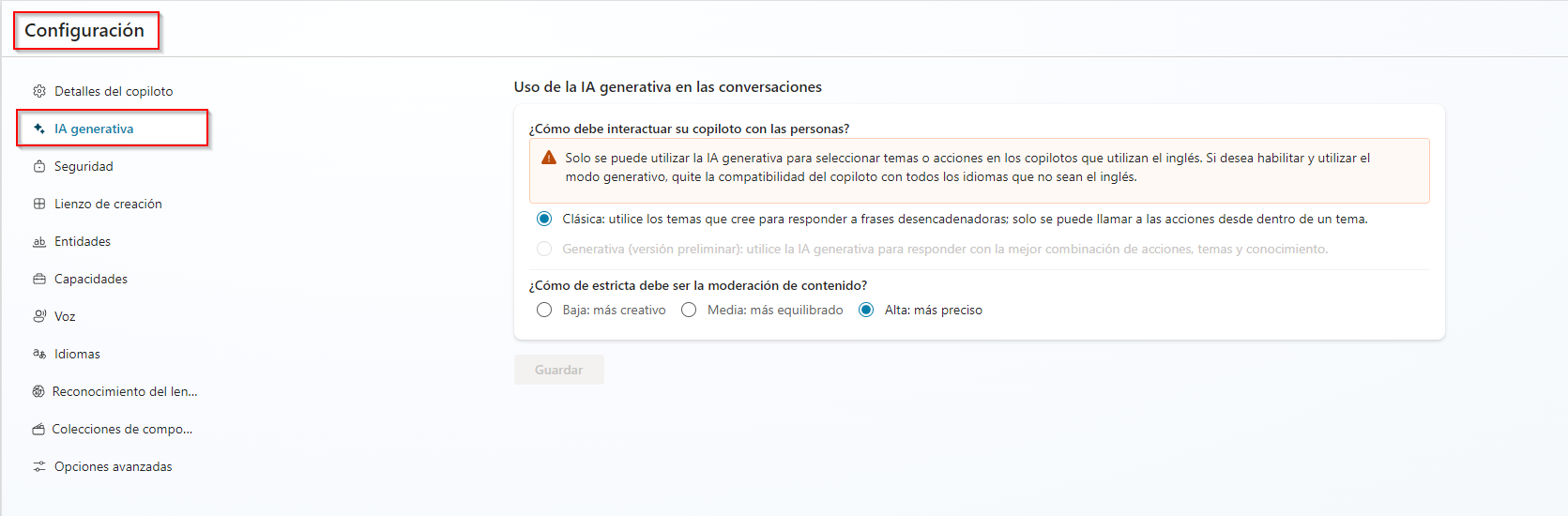 La página IA generativa en Copilot Studio le permite personalizar las capacidades generativas del agente. Le proporciona diferentes opciones para configurar la IA generativa en el agente. Puede obtener acceso a la página de configuración de la IA generativa en Configuración > IA generativa.