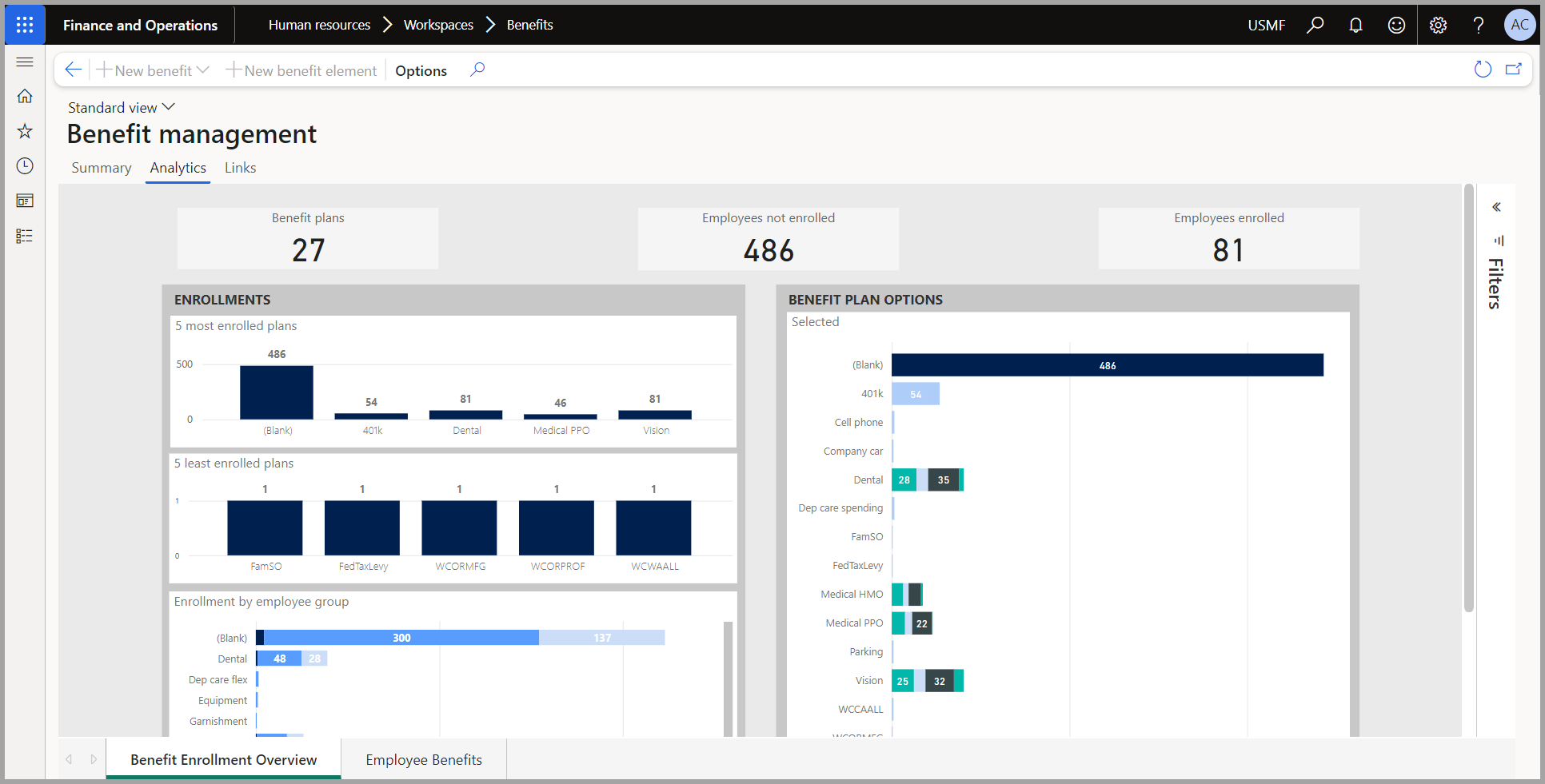 La siguiente imagen muestra análisis de Power BI dentro del espacio de trabajo de administración de beneficios. Este panel de Power BI le permite realizar un seguimiento y supervisar la inscripción de beneficios dentro de su organización. Puede utilizar filtros y herramientas de Power BI dentro de las aplicaciones de finanzas y operaciones para analizar los datos.