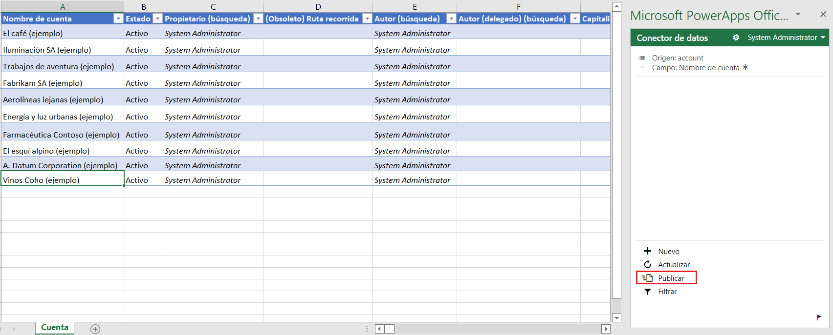Después de unos momentos, sus datos aparecerán en la hoja de cálculo, y ya podrá usar Excel para agregar, actualizar o eliminar datos usando los botones en el panel de complementos. El botón Publicar (en el panel del complemento) sirve para guardar los cambios.