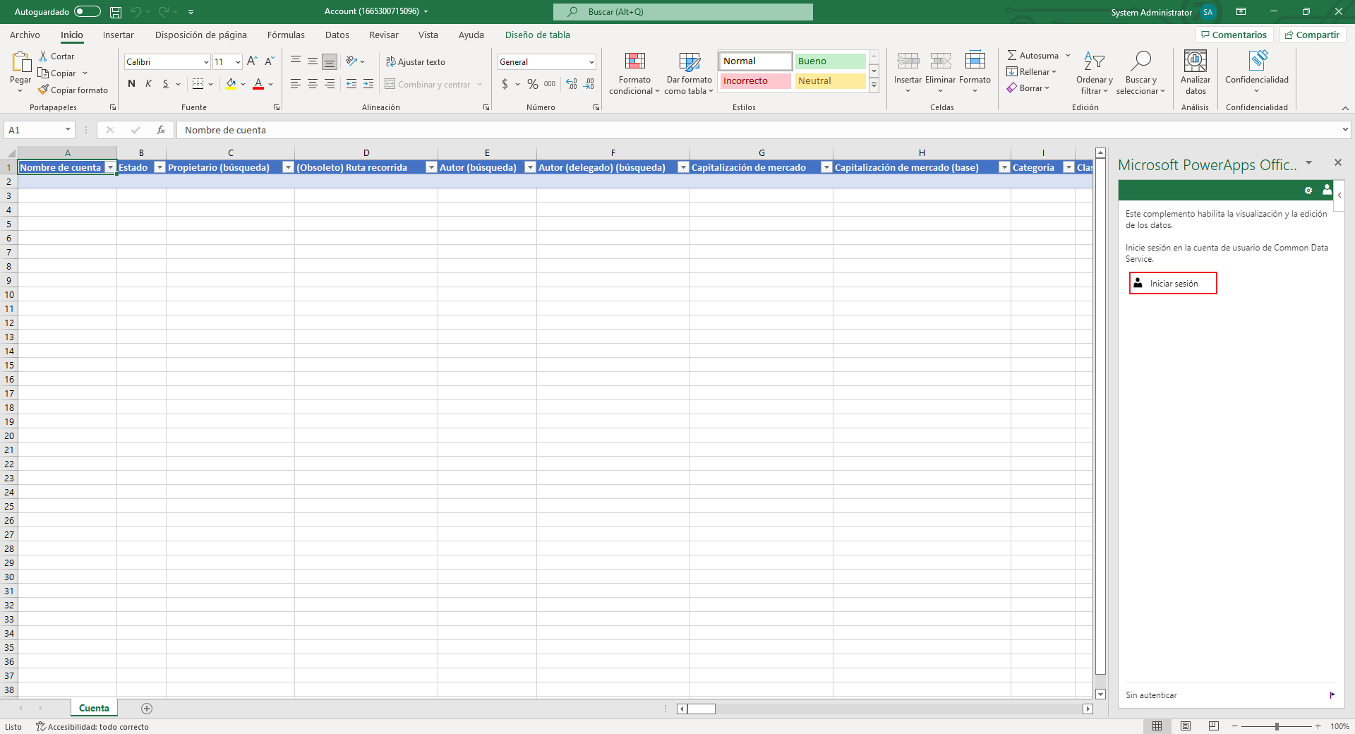 Power Apps descargará el archivo en la carpeta Descargas de su navegador, desde donde podrá abrirlo en Excel Online o en su aplicación de Excel. Cuando abra el archivo, el sistema le pedirá Iniciar sesión para habilitar el complemento de Office de Microsoft Power Apps. No aparecen sus datos. Seleccione Iniciar sesión.