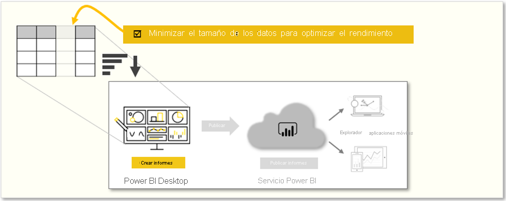 Un modelo semántico más pequeño usa menos recursos (memoria) y acelera la actualización de datos, los cálculos y la representación de objetos visuales en informes. Por lo tanto, el proceso de optimización del rendimiento implica minimizar el tamaño del modelo semántico y hacer un uso más eficiente de los datos del modelo. Estas son las decisiones que debe tomar sobre el diseño: