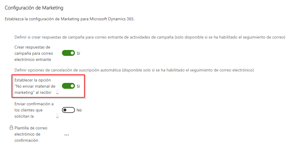 Para que el contacto cancele la suscripción automáticamente cuando seleccione Cancelar suscripción, debe configurar la aplicación para que lo haga automáticamente. En la aplicación Centro de ventas, vaya al área Configuración de la aplicación. En el grupo Administración de ventas, seleccione Configuración de marketing. En la página Configuración de marketing, establezca la opción Establecer la opción "No enviar material de marketing" al recibir un mensaje de anulación de suscripción en Sí.