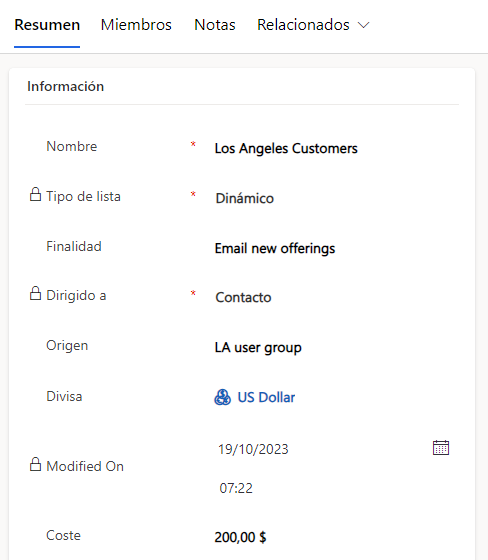 Dinámico: agrega y actualiza miembros de la lista dinámicamente según los criterios de búsqueda que establezca. Por ejemplo, si desea ejecutar una campaña para miembros de una ciudad específica, utilice una lista dinámica. Una lista de marketing dinámica recupera la lista actualizada de miembros cada vez que abre la lista, crea una campaña exprés a partir de la lista o distribuye una actividad de campaña para una campaña asociada con la lista.
