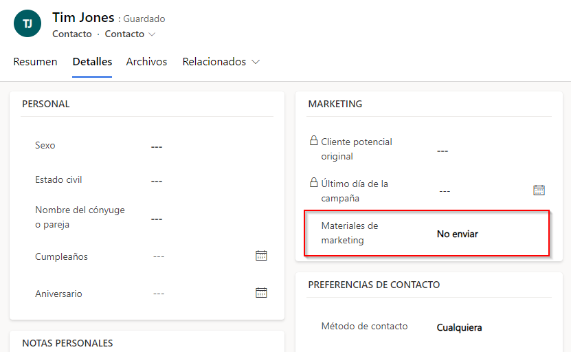 Cuando un miembro selecciona el vínculo para cancelar la suscripción, la configuración Materiales de marketing para ese miembro se establece automáticamente en No enviar. Como resultado, se eliminan de futuras comunicaciones por correo electrónico de marketing.