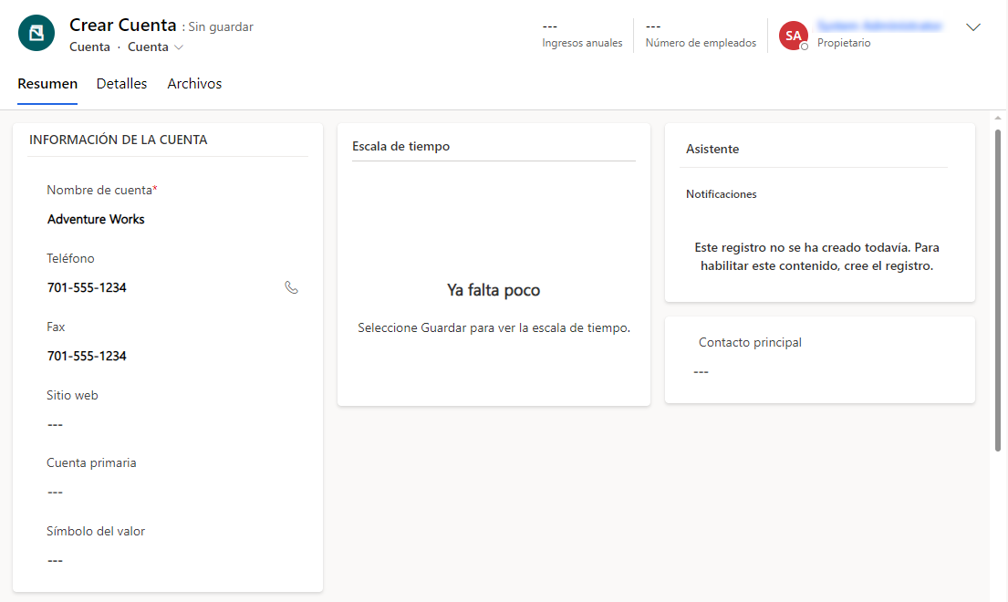 Si bien una cuenta puede tener varios contactos, como un representante de compras, un director ejecutivo o un presidente, cada cuenta normalmente tiene un contacto principal que actúa como punto de contacto principal para la cuenta. En Dynamics 365, este punto de contacto principal es el contacto principal de la cuenta. Puede configurar cualquier contacto asociado con una cuenta como contacto principal. Después de definir un Contacto principal para una cuenta, su número de teléfono y dirección de correo electrónico se muestran en el registro de la cuenta.