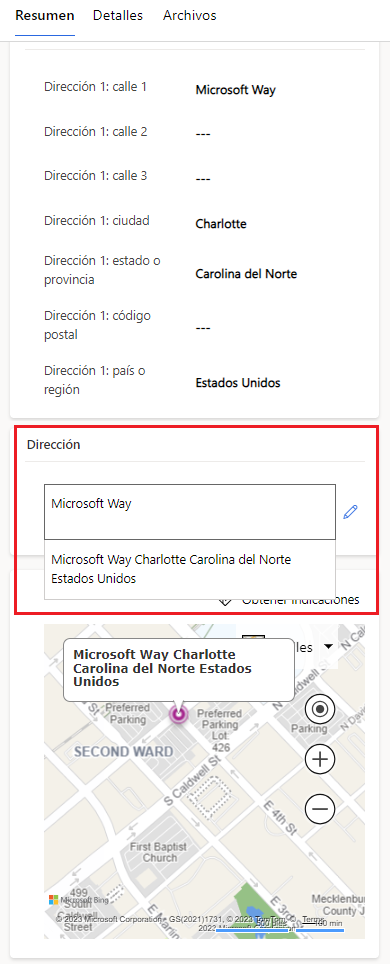 Para los clientes que compraron Sales Enterprise y Sales Premium, el administrador del sistema puede activar las sugerencias de direcciones. Cuando esa función está habilitada, Mapas de Bing puede completar los detalles de la dirección de la cuenta por usted. La sugerencia de dirección está disponible con contactos, cuentas y clientes potenciales.