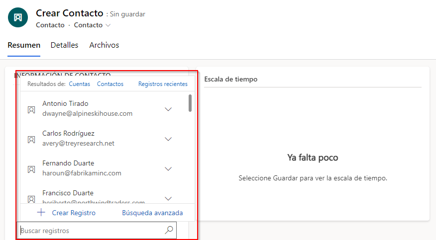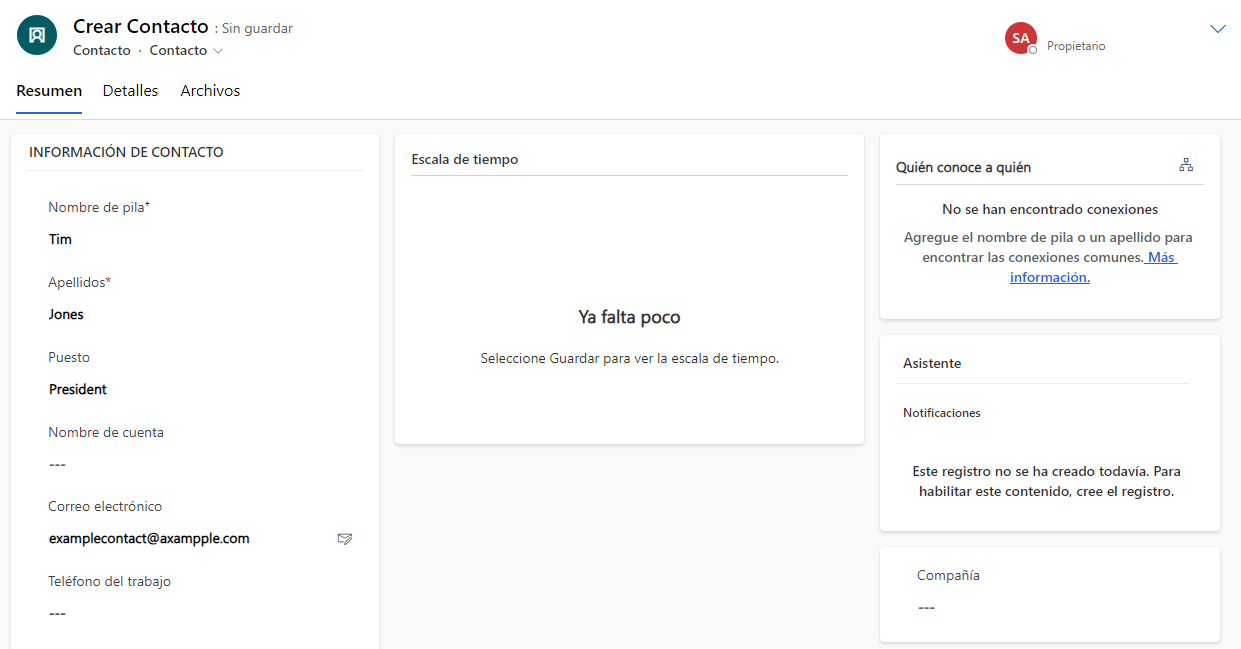 Cuando crea un registro de contacto, solo se requiere el apellido; sin embargo, debería considerar completar datos como el nombre de pila, cargo, dirección de correo electrónico, número de teléfono y detalles de la dirección.