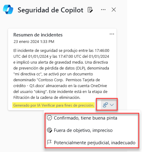 Para cualquier contenido generado por IA, puedes proporcionar comentarios y precisión del contenido. Seleccione la solicitud de comentarios en la parte inferior derecha de la ventana de contenido y seleccione entre las opciones disponibles: confirmadas, se ve genial, fuera del destino, inexacta o potencialmente perjudicial, inapropiada.