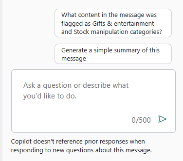 La revisión de las comunicaciones es una parte integral de la protección del panorama comunicativo de su organización, pero también lleva mucho tiempo revisar contenidos de cientos de palabras o que contienen archivos adjuntos. Con Copilot ahora puede: