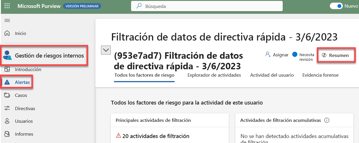Inicie sesión en el portal de cumplimiento de Microsoft Purview o en el nuevo portal de Microsoft Purview y vaya a la solución De administración de riesgos internos. Ve a la cola de alertas para seleccionar la alerta que deseas revisar. Se muestra información sobre la alerta y la opción para resumir la alerta.