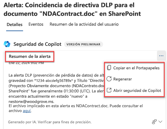 Seleccione Resumir para que Copilot genere el resumen de alertas. Desde el resumen de alertas, puede usar los puntos suspensivos en la parte superior derecha del resumen de alertas para copiar la respuesta al portapapeles, regenerarlo o abrirlo en la experiencia independiente de Copilot.
