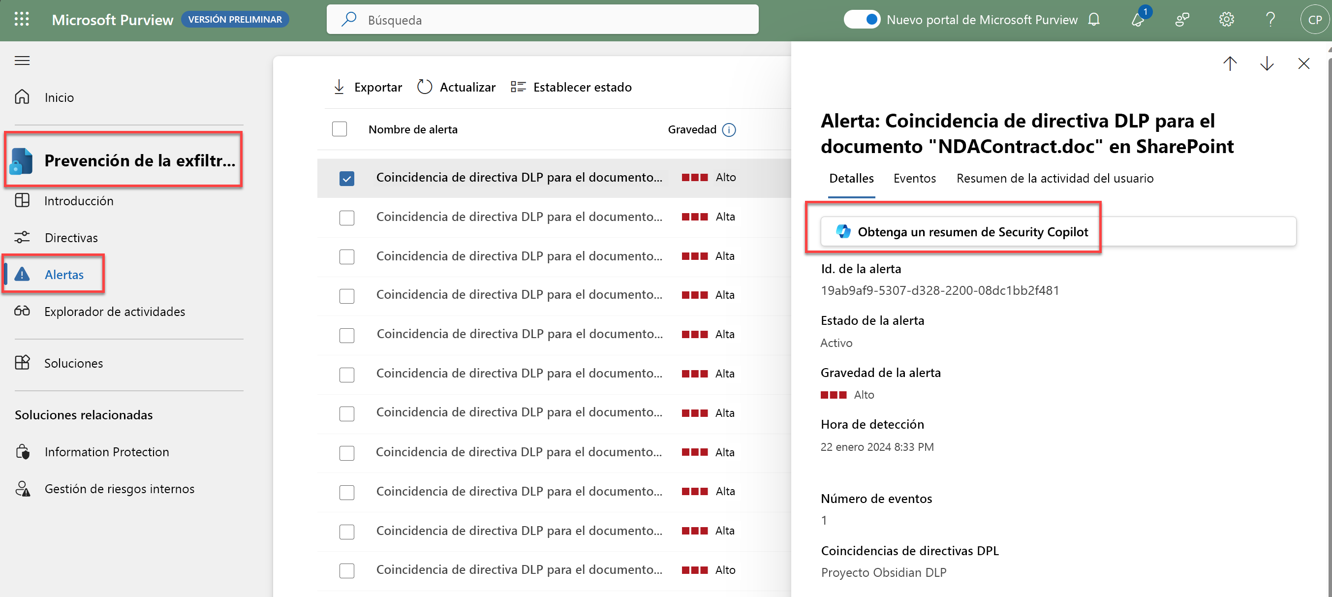 Para resumir las alertas de Prevención de pérdida de datos mediante Copilot: