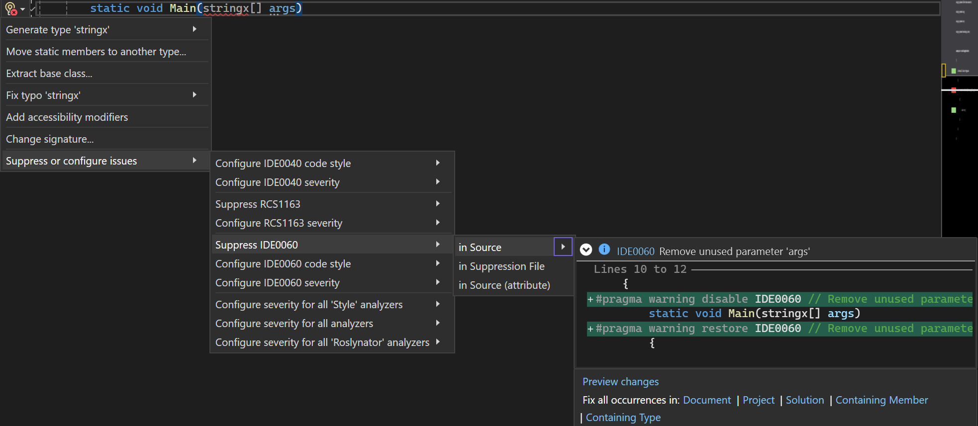 Si elige en origen (atributo), verá una vista previa del atributo SuppressMessageAttribute que se agregará al código.