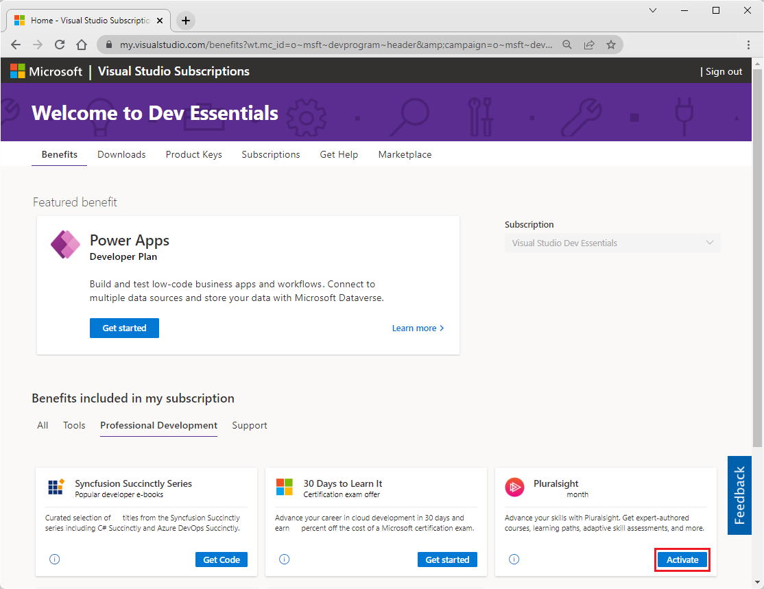 Para activar la ventaja de Pluralsight que se incluye con la suscripción de Visual Studio, vaya a Suscripciones de Visual Studio y seleccione la pestaña Ventajas . En Ventajas incluidas en mi suscripción, en el icono de Pluralsight, seleccione Activar.