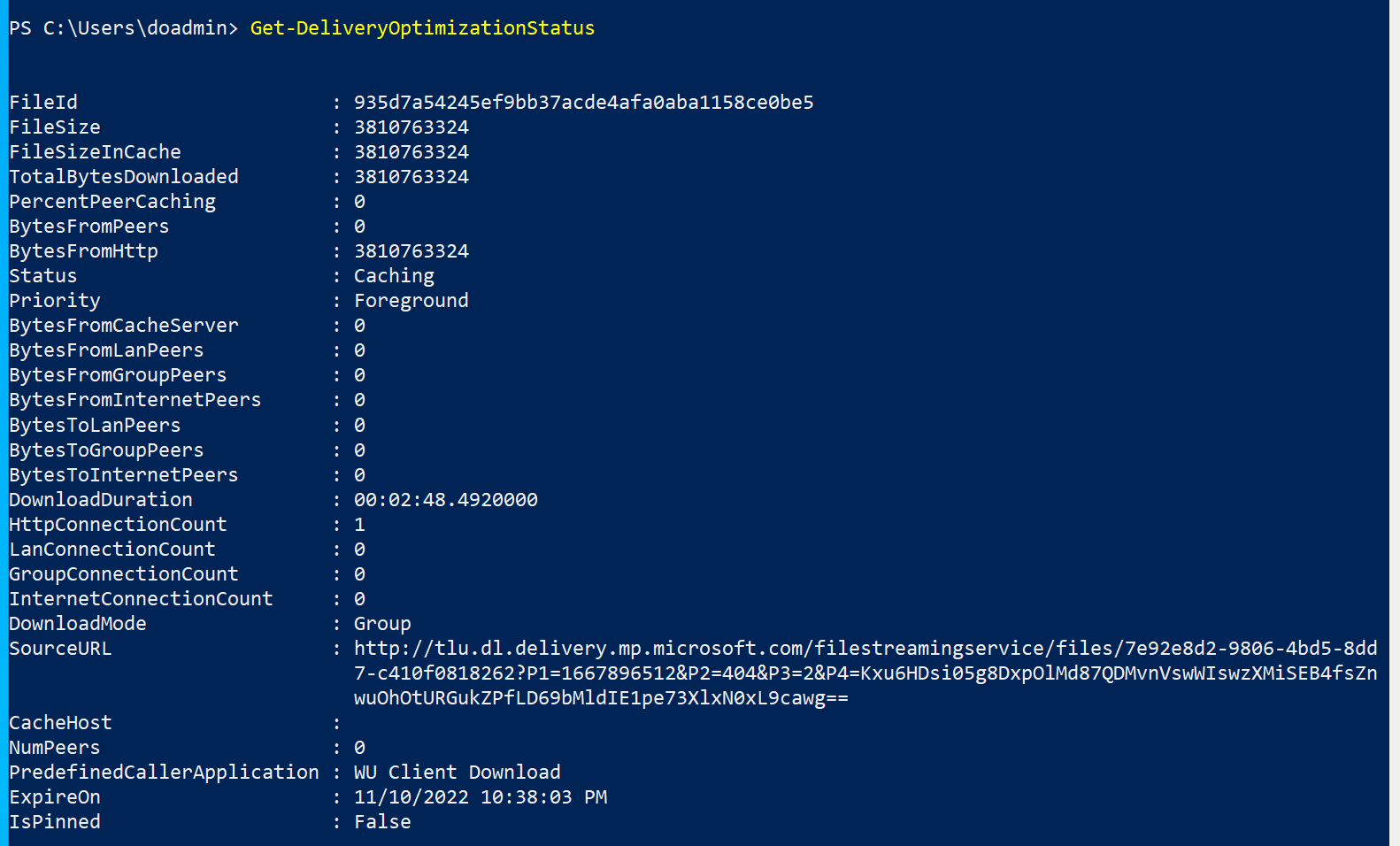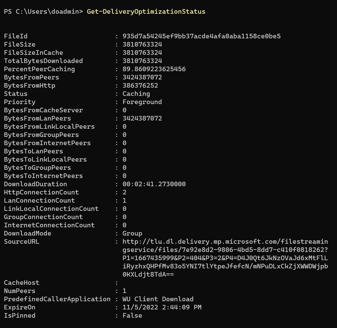 - Abra la consola de PowerShell como administrador. Ejecute "Get-DeliveryOptimizationStatus".