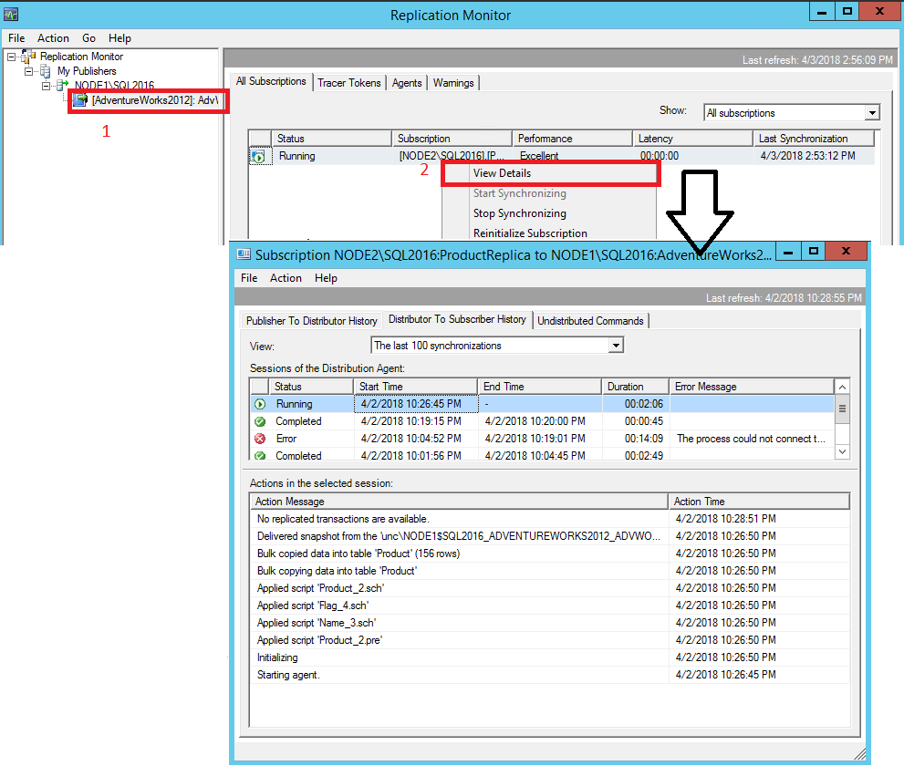 Error messages: Agent 'NODE1\SQL2016-AdventureWorks2022-AdvWorksProductTrans-NODE2\SQL2016-7' is retrying after an error. 89 retries attempted. See agent job history in the Jobs folder for more details.The error indicates that the Distribution Agent is retrying. To find more information, check the job history for the Distribution Agent: