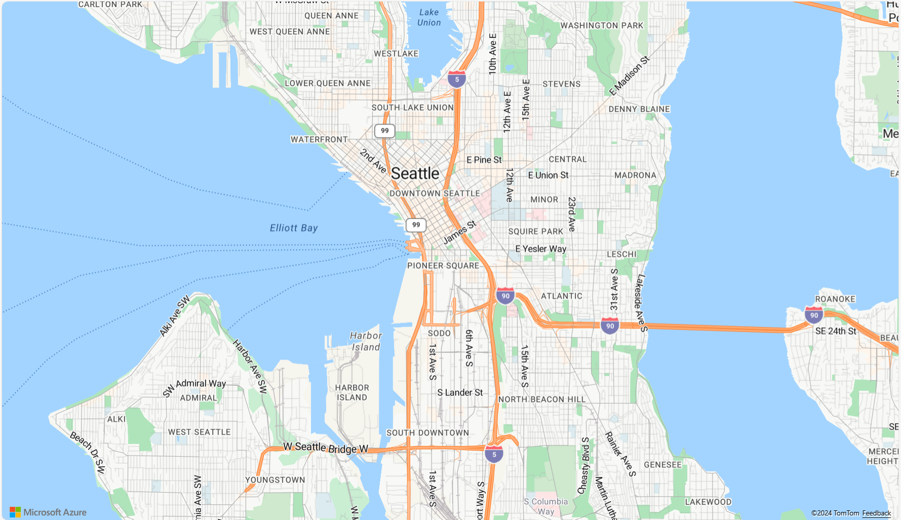 <!DOCTYPE html> <html> <head> <title></title> <meta charset="utf-8"> <!-- Ensures that Internet Explorer and Edge uses the latest version and doesn't emulate an older version --> <meta http-equiv="x-ua-compatible" content="IE=Edge"> <!-- Ensures the web page looks good on all screen sizes. --> <meta name="viewport" content="width=device-width, initial-scale=1, shrink-to-fit=no"> <!-- Add references to the Azure Maps Map control JavaScript and CSS files. --> <link rel="stylesheet" href="https://atlas.microsoft.com/sdk/javascript/mapcontrol/3/atlas.min.css" type="text/css"> <script src="https://atlas.microsoft.com/sdk/javascript/mapcontrol/3/atlas.min.js"></script> <script type="text/javascript"> //Create an instance of the map control and set some options. function InitMap() { var map = new atlas.Map('myMap', { center: [-122.33, 47.6], zoom: 12, language: 'en-US', authOptions: { authType: 'subscriptionKey', subscriptionKey: '<Your Azure Maps Key>' } }); } </script> <style> html, body { margin: 0; } #myMap { height: 100vh; width: 100vw; } </style> </head> <body onload="InitMap()"> <div id="myMap"></div> </body> </html>Open the file in your web browser and view the rendered map. It should look like the following image: