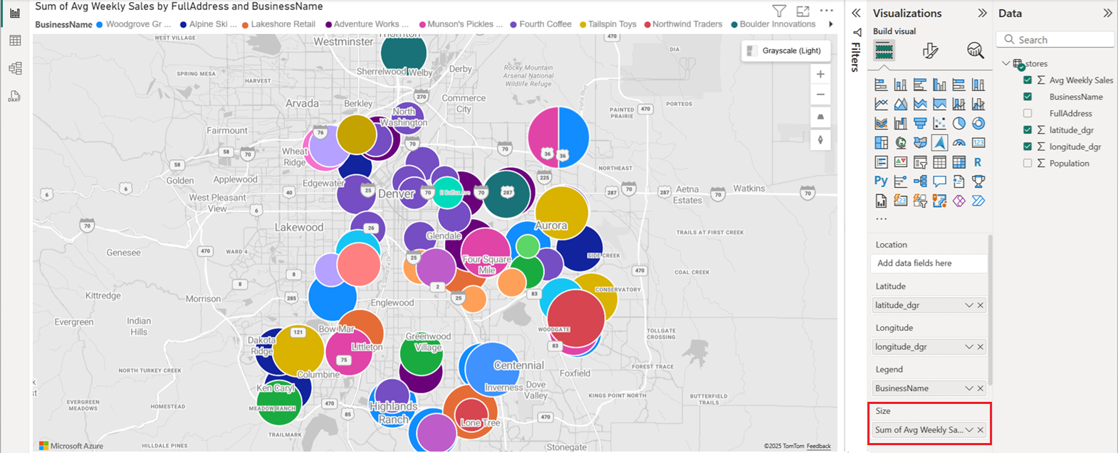 To scale the data relatively, drag a measure into the Size bucket of the Fields pane. In this example, we're using Avg Weekly Sales column.