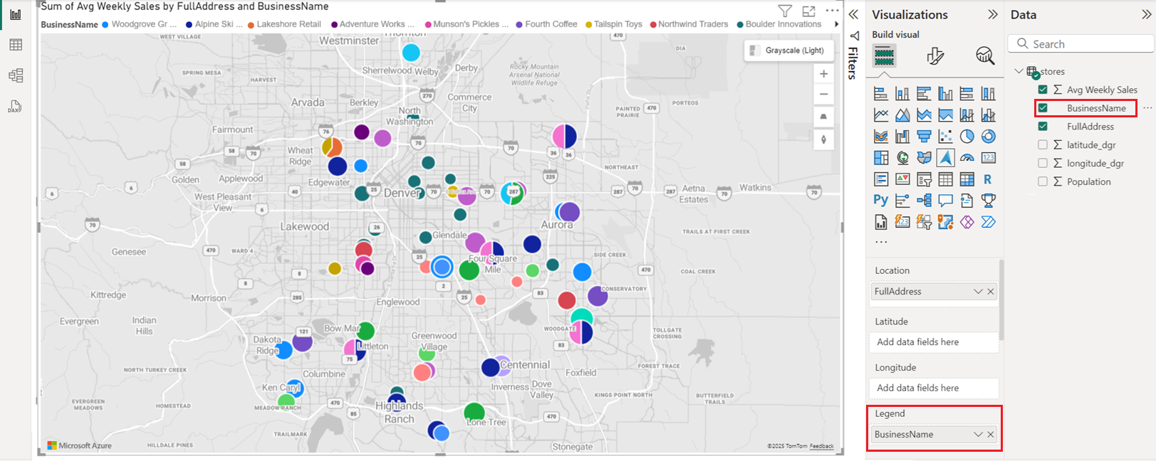 To color the data based on categorization, drag a categorical field into the Legend bucket of the Fields pane. In this example, we're using the BussinessName column.
