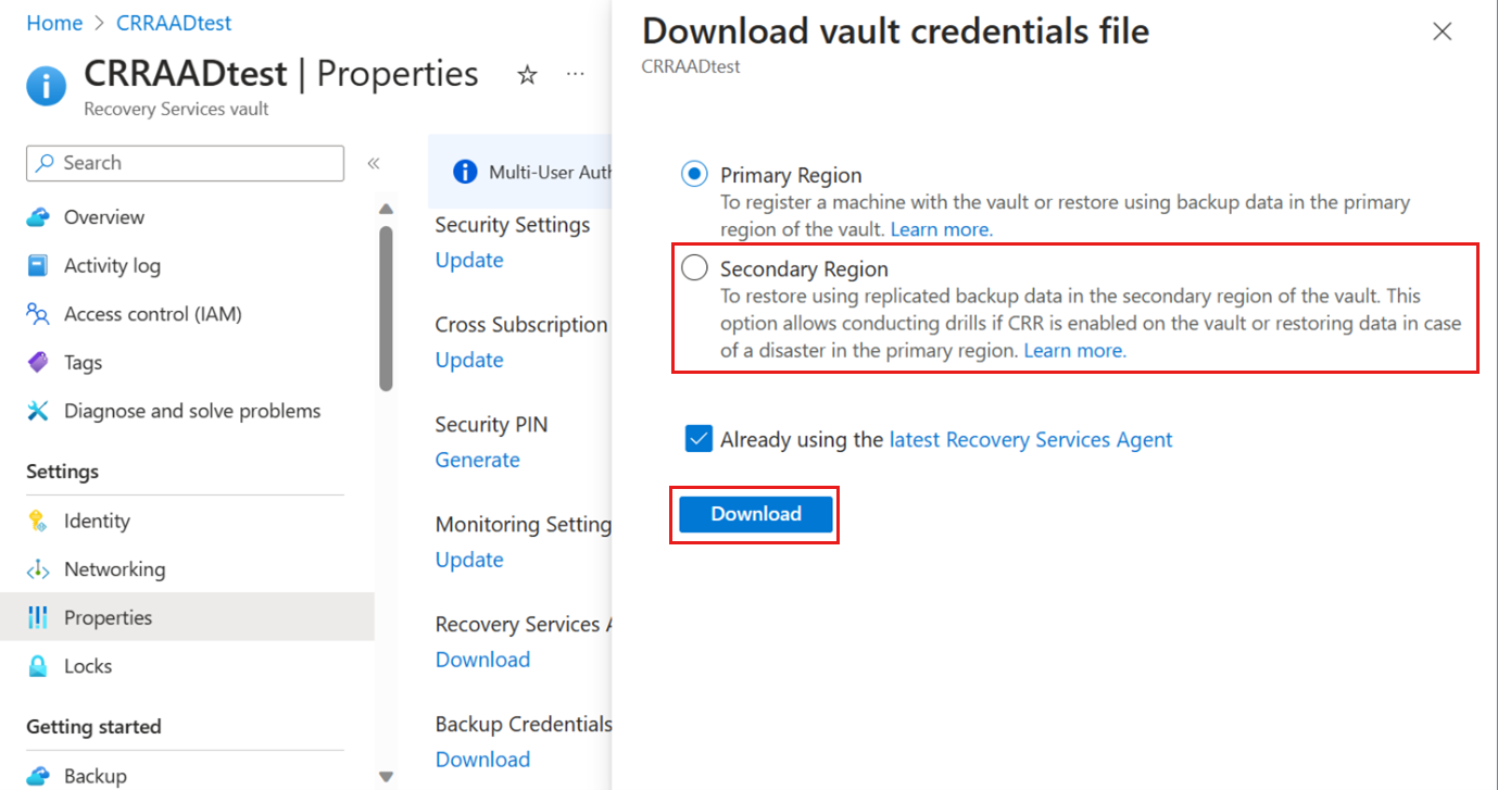 - If you're doing an alternate server restore from the backup data in the secondary region using Cross Region Restore, then select Secondary Region to download the vault credentials.
