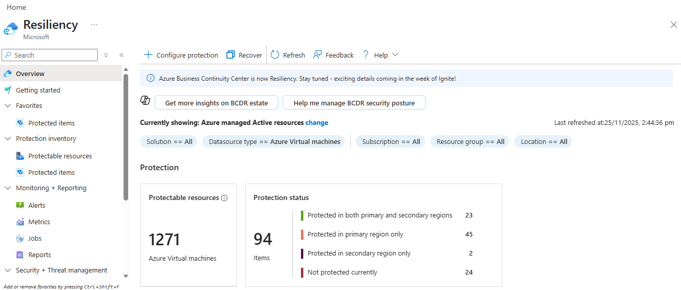 Go to Resiliency > Overview, and then select + Configure protection.