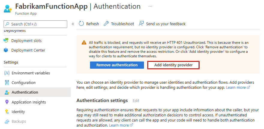 On the function app menu, under Settings, select Authentication, and then select Add identity provider.