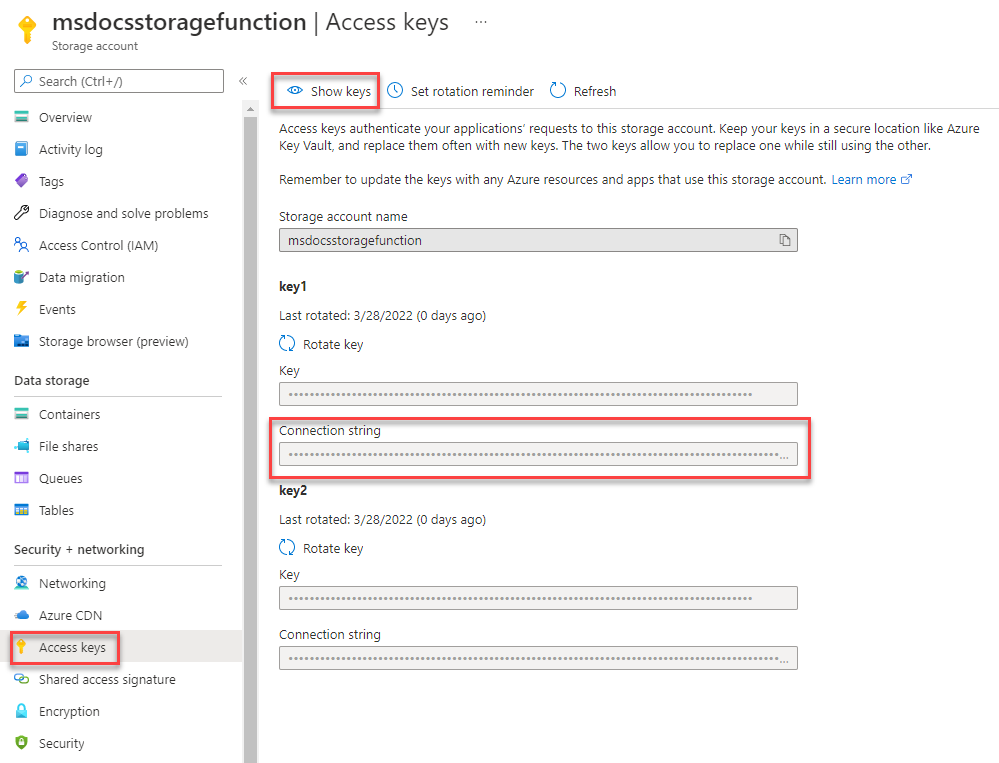 These values are necessary when we need to connect our Azure Function to this storage account.