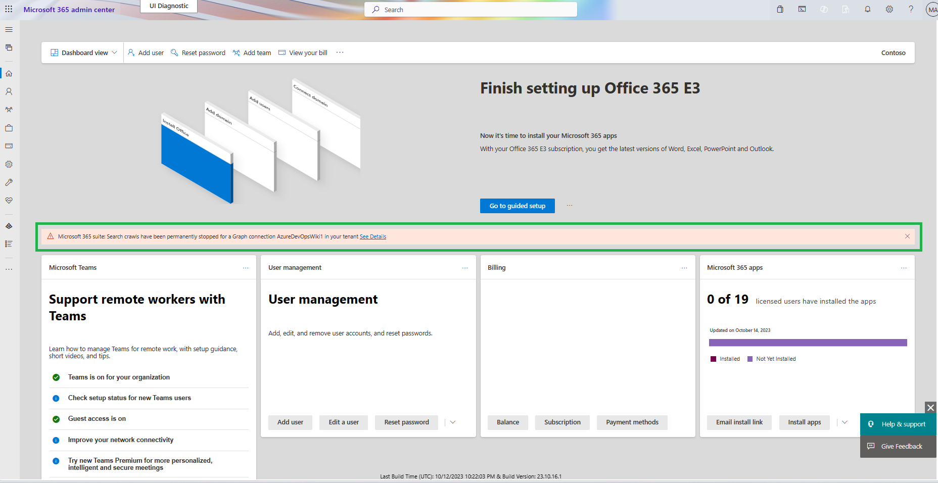 If there are active notifications, admins receive alerts in the form of notification bars on the Microsoft Admin Center home page. These bars display the connection ID associated with the failed crawls. Admins can click on the notification bars to view more details or remove them from the page.