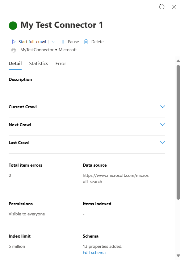 This page provides insights into the connector's daily operations, as well as an overview of logs and error history. After creating a connection, the number of processed items is displayed on the Connectors tab of the Microsoft Search page. Once the initial full crawl is completed successfully, the progress of periodic incremental crawls is shown.