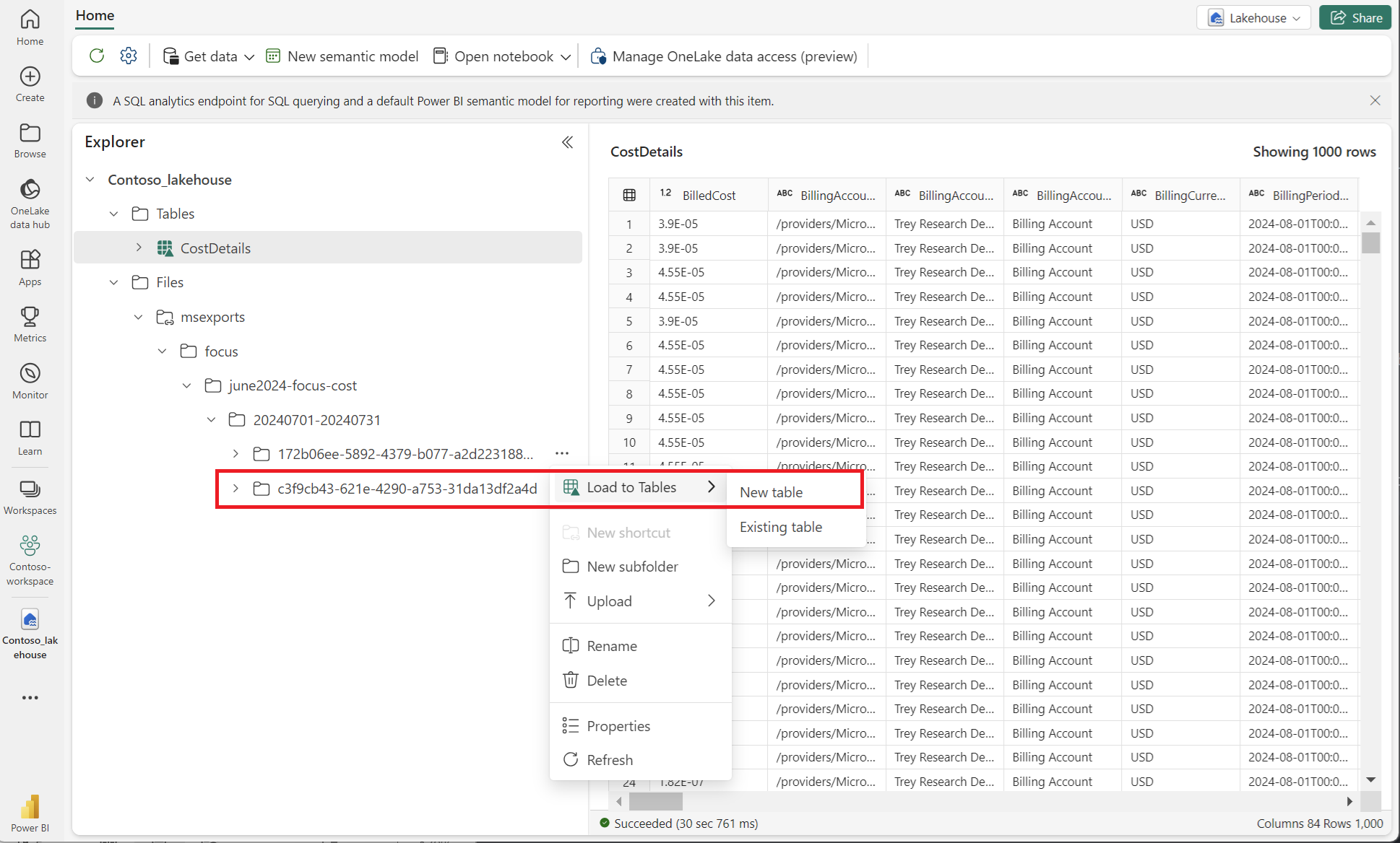 After the shortcut gets created, you can view the FOCUS cost data inside Files. You can load the data directly into a Fabric table by using the following steps.