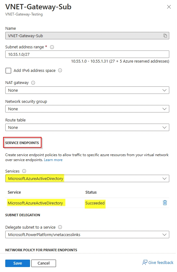 • You can't delegate a subnet called gatewaysubnet to the Power Platform admin center. This restriction is because it's a reserved word for the Azure Gateway Subnet feature.