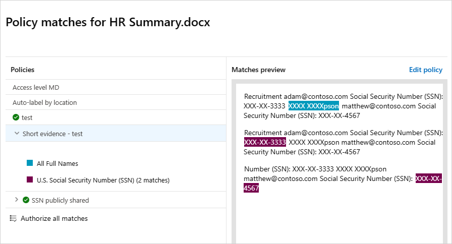 For example, you can select Collaborators to see who has access to this file, and you can select Matches to see the Social Security numbers.