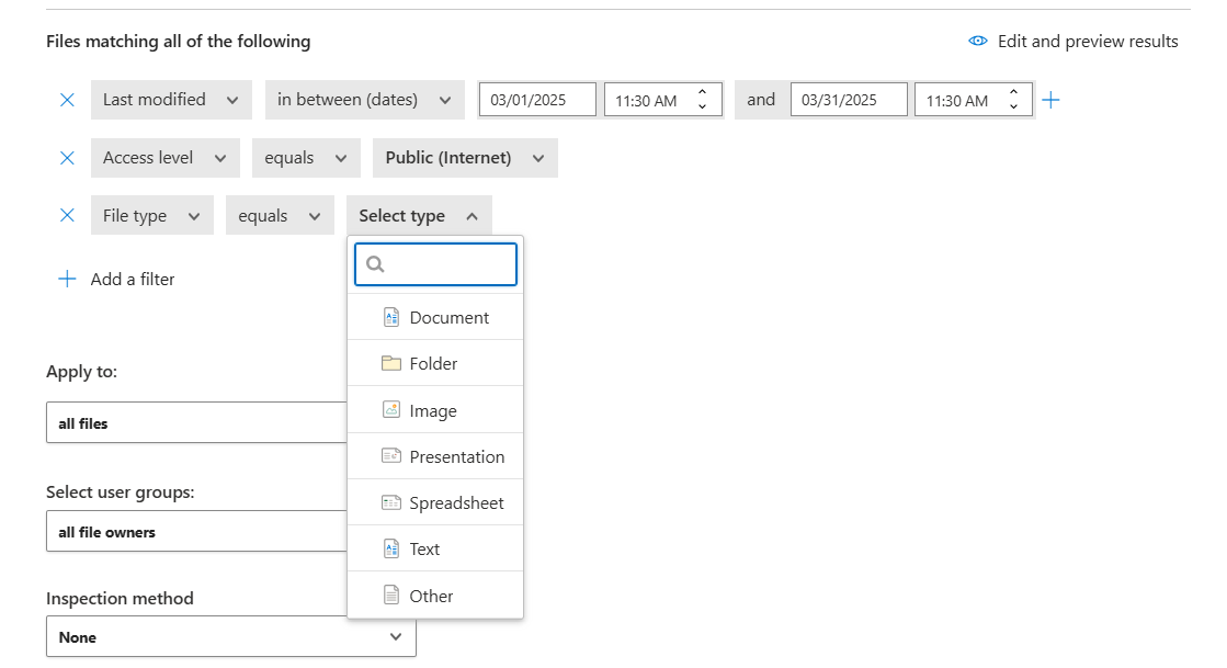 File type – Defender for Cloud Apps scans the file to determine whether the true file type matches the MIME type received (see table) from the service. This scan is for files that are relevant for data scan (documents, images, presentations, spreadsheets, text, and zip/archive files). The filter works per file/folder type. For example, All folders that are ... or All spreadsheet files that are...